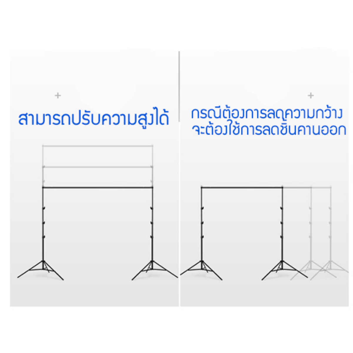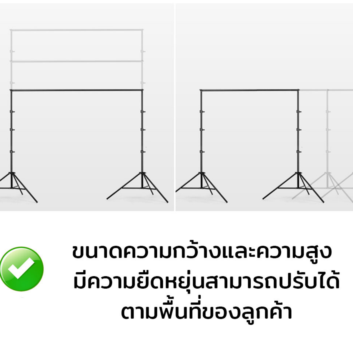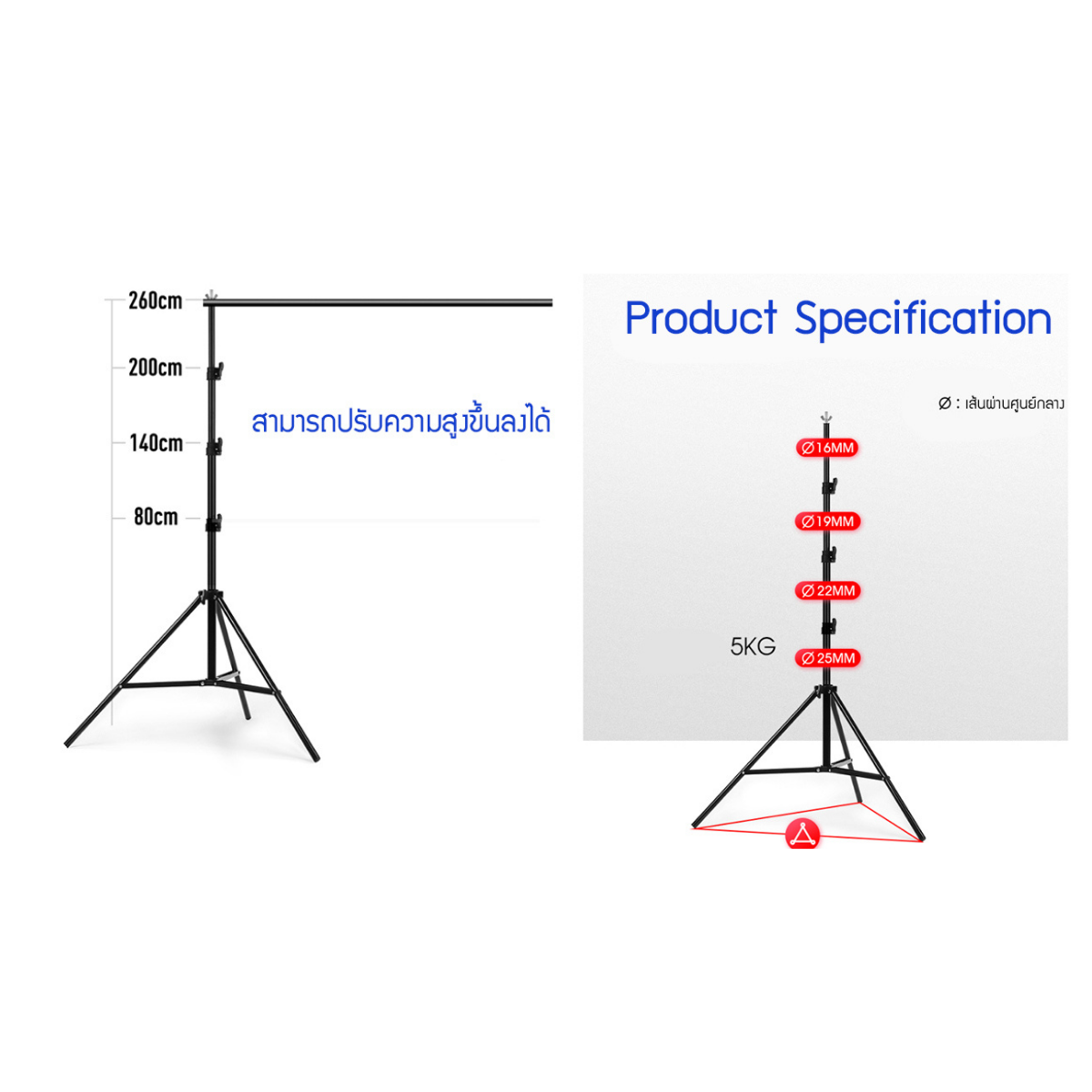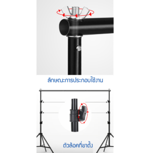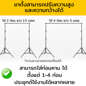 • ความสูงปรับได้ ต่ำสุด 1 เมตร สูงสุด 2.6 เมตรและกว้างสุด 3 เมตร รองรับการถ่ายภาพหลากหลายรูปแบบ